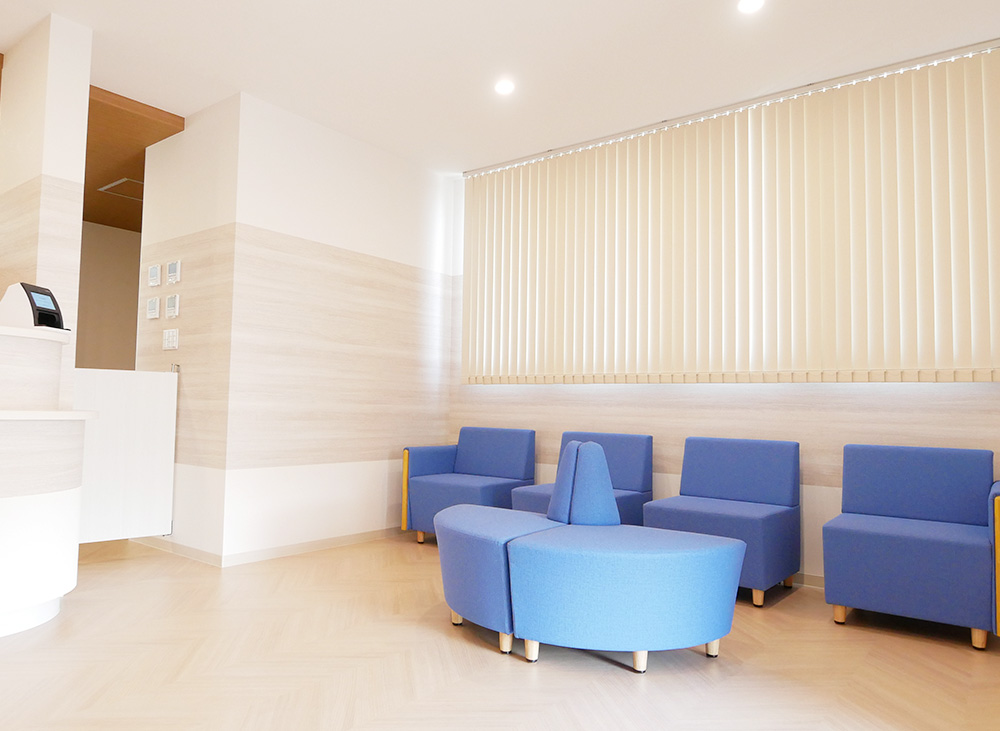 落ち着いた青色のソファを設置し、リラックスできる空間となっております。診療の前後は、こちらでごゆっくりお過ごしください。