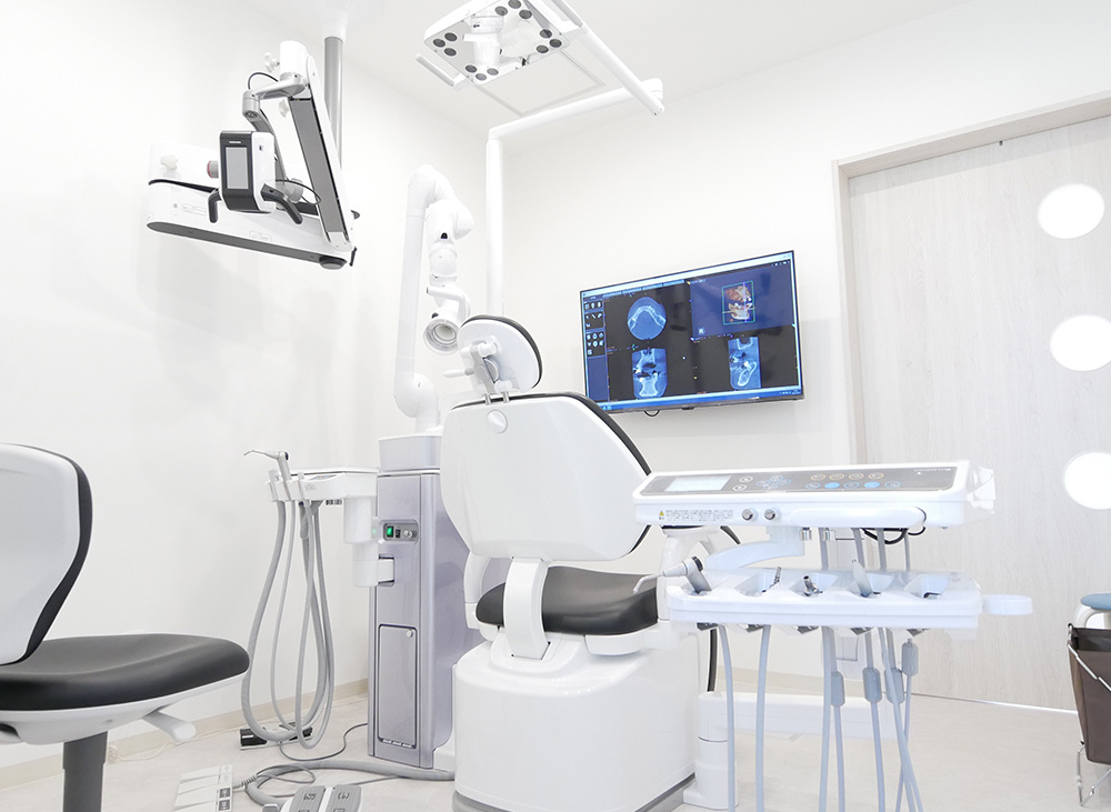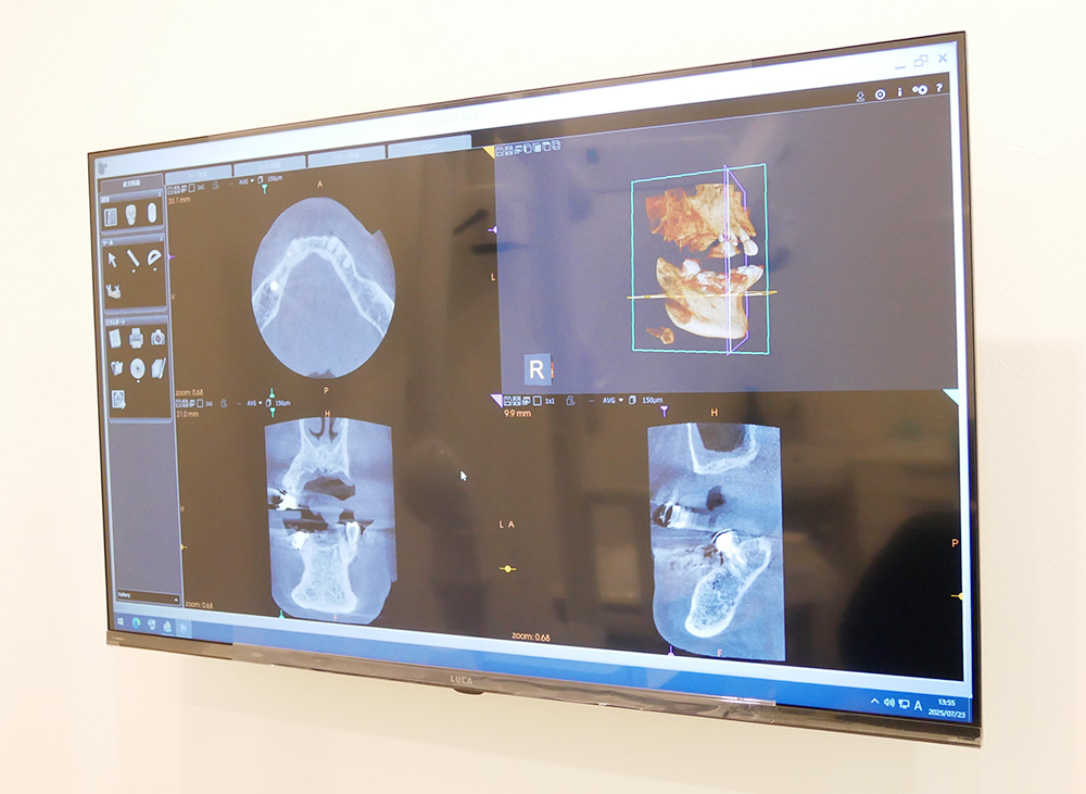 パノラマレントゲンと3D画像を撮影し、より正確な診断が行えます。撮影もお顔の周りを一周するだけで終了し、短時間での撮影が可能です。